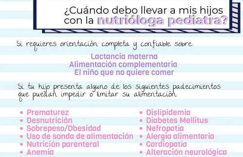 ¿Cuándo debo llevar a mis hijos con la nutrióloga pediatra? Cuando requieras orientación completa y confiable sobre lactancia materna, alimentación complementaria o tienes un niño que no quiera comer.